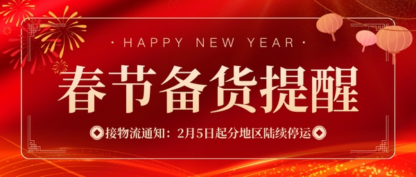 您好!新春將至,謹(jǐn)代表我司全體同仁,預(yù)祝您新春愉快、萬事順?biāo)臁?br />感謝您長(zhǎng)期以來的支持與信任,F(xiàn)有一則關(guān)于春節(jié)物流安排的重要通知,敬請(qǐng)您知悉,以便提前做好生產(chǎn)安排。