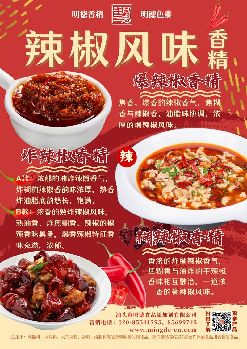 明德辣椒風味系列香精 層次鮮明 爆香濃郁汕頭市明德食品添加劑有限公司推出的辣椒風味系列香精,涵蓋爆辣椒、炸辣椒、糊辣椒等多種類型。產(chǎn)品風味真實,香氣飽滿,適用于調(diào)味品、復合調(diào)味料、醬料、鹵制食品、肉制品等B端應用,幫助工廠快速打造具有記憶點的辣椒風味。