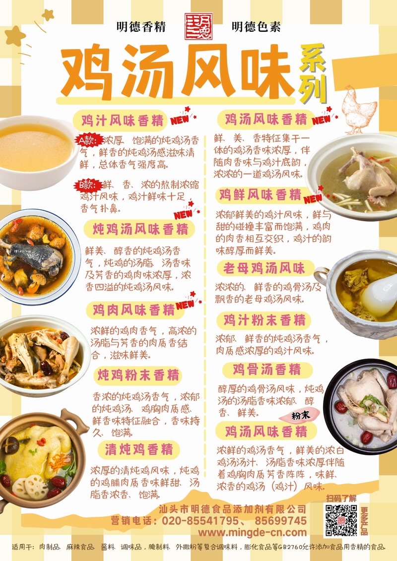 明德雞湯風味香精 濃郁鮮香 還原地道雞湯本味汕頭市明德食品添加劑有限公司的雞湯風味香精系列,涵蓋雞汁、雞湯、雞鮮風味、老母雞湯、雞肉風味、雞粉末、雞骨湯、清燉雞等多種品類。產(chǎn)品具備真實的雞肉鮮香、湯香、油香與骨香特征,能夠為醬料、調(diào)味品、肉制品、腌制料及復合調(diào)味料等B端應用提供穩(wěn)定、濃郁的雞湯風味解決方案,幫助工廠快速打造風味醇厚、回味悠長的雞香產(chǎn)品。